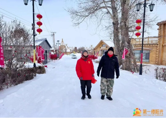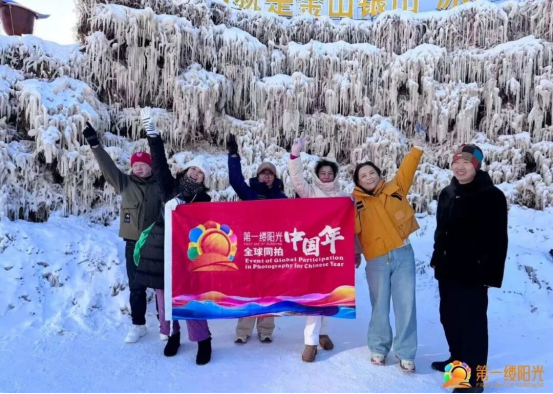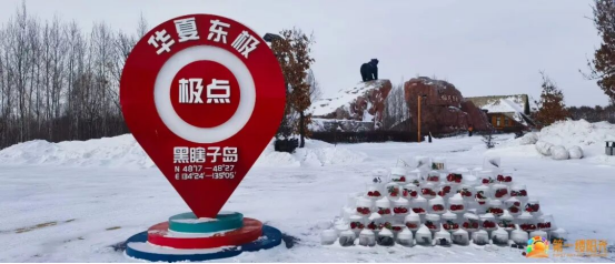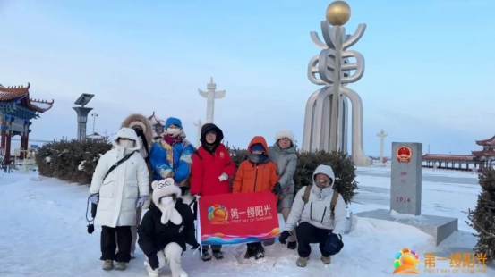 沐浴着难得一见的第一缕阳光,大家举起活动旗帜走向冰封的江面、庄严的界碑、标志性的东极雕塑前合影,一些游客也主动参与进来开展互动,各自表达在祖国最东端迎接第一缕阳光的喜悦。